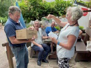 Die Gruppe bedankte sich zum Abschluss bei ihrer Wanderleiterin mit einer Kiste Pfälzer Spezialtäten.