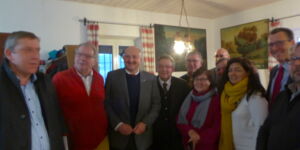 Bürgermeister Götz, die stellvertretenden Landrätin Christine Haupt-Kreutzer, der Landtagsabgeordnete Volkmar Halbleib und die Bundestagsabgeordneten Bernd Rützel und Andreas Schwarz als Mitglied des Finanzausschusses, beraten mit Mitgliedern der Ortsgruppe, wie die Erneuerung des NaturFreunde-Gästehauses aussehen und finanziert werden kann.