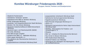 Die Initiatoren hätten damals nicht geglaubt, jemals soviele Gruppen, Organisationen, Parteien und Einzelpersonen unter einem Dach vereinen zu können – doch es gelang. Eine konfliktfreie Zusammenarbeit mit dem jeweils respektvollen Abwägen der Argumente des Gegenüber ist möglich. Allein dies ist schon Beweis dafür, wie wichtig und wertvoll der Würzburger Friedenspreis für die Region ist.