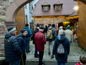 In etwas mehr als 2,5 Stunden erreichten die Wanderer nach vielen Auf- und Abbewegungen endlich Thüngersheim und wurden dort von zwar wenigen, doch liebevoll geschmückten und beleuchteten Höfen und Ständen begrüßt und eingeladen, sich an Glühwein und Bratwurstbrötchen zu laben. Manch einer deckte sich noch mit kleinen Geschenken und Mitbringseln ein, denn es wurden diverse Schnäpse, Liköre, Marmeladen, Brotaufstriche, Socken, Mützen, Genähtes, Metallarbeiten und besonders Engel verkauft. Außerdem konnten in den Kulturgaden die ausgestellten historisch nachempfundenen Burganlagen betrachtet werden.