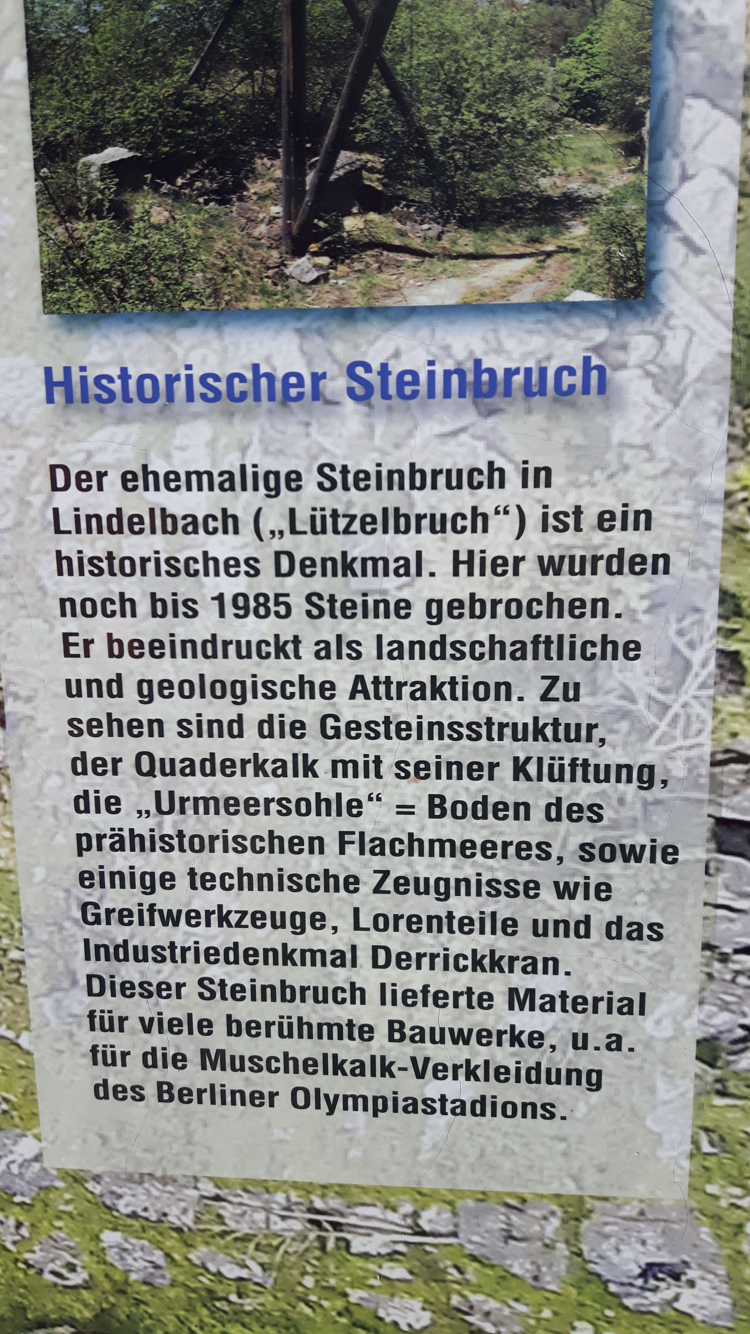 Von da aus war es nicht mehr weit, bis zum historischen Steinbruch von Lindelbach. Hier an der ehemaligen Kantine der Steinbrucharbeiter, machten wir unsere Mittagsrast und versorgten uns selbst aus unseren Rucksäcken. Das von herbstlichen Sonnenblumen umgebene Areal bot uns schattige oder sonnige Sitzplätze und lud zum Verweilen ein. Vor uns lag nun noch der Steinbruch, den wir mittels Infotafeln und auf eigene Faust, ganz individuell erkunden konnten. Dabei entdeckten wir nicht nur ein Industriedenkmal, den Derrickkran – nach einem Londoner Henker benannt - der den Arbeitern ehemals gute Dienste beim Anheben der schweren Steine bot, sondern auch die riesigen Quaderblöcke aus Muschelkalk, die in vielen historischen Gebäuden unseres Landes, wie zum Beispiel im Reichstag von Berlin verbaut wurden. Auf dem Rückweg nach Theilheim, ganz in der Nähe der Autobahn A 3, streiften wir noch die Quelle des Lützelbaches und kamen am einstigen Wirtschaftshof eines Zisterzienserklosters vorbei, das bereits im 14. Jahrhundert aufgegeben wurde und im Zuge des Autobahnbaus wieder entdeckt wurde.