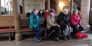 Die mehr als 1200-jährige Geschichte dieses Ortes forderte uns zu einem mehr als einstündigen Dorfrundgang mit einer betagten, aber von einer Heimatliebe geprägten Führerin heraus. „Wiesen, Wasser, Wein und Holz, das ist der Wiesenbronner Stolz“, so der Titel unserer Wanderung zeigt sich schon im Ort. Start und Ziel war der Weinfestplatz „Am Seegarten“, ein See, der bis in die 60-er Jahre noch die Ortsmitte prägte, heute aber trocken gelegt ist. Der kurze Weg zur Kirche inmitten der ehemaligen Kirchenburg lohnte sich. Bei Gefahr zogen sich die Menschen in die Gaden zurück, welche den ganzen Kirchberg z.T. zwei Stockwerke tief unterkellern. Kirche, Schulhaus, Gaden, die alte Schmiede, alle alten Gebäude bestehen aus Schilfsandstein, gebrochen aus den Steinbrüchen im nahen Wald. Das evangelische Gotteshaus erhielt seine heutige Form um das Jahr 1620, die freigelegten Fresken weisen uns aber auf die frühere Entstehungsgeschichte hin. Am Schloßgraben vorbei erreichten wir die Synagoge und einige ehemalige Häuser, heute ganz toll restauriert, welche Zeugnis abgeben für das lange friedliche, gemeinsame Leben von jüdischen und deutschen Menschen; die Kinder gingen alle in ein Schulhaus, nur der jüdische Religionsunterricht fand in einem kleinen Haus statt. Ende unserer Führung war das alte Rathaus mit seinem sehenswerten Glockenspiel, das stündlich den Winzer und seinen Kontrahenten, den Häcker, „schlagen“lässt.