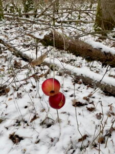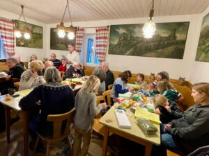 15 Kinder waren am 4. Adventssonntag der Einladung von Organisatorin Natalie Durhack gefolgt und mit ihren Eltern gekommen, um an der traditionellen Waldweihnacht teilzunehmen. Schnell waren die mitgebrachten Äpfel, Karotten Meisenknödel und Nüsse vorbereitet, um sie anschließend beim Spaziergang durch den verschneiten Wald den Tieren „mundgerecht“ servieren zu können. Die Kälte von minus 10 Grad machte allen klar, dass wir den Tieren in dieser Zeit helfen müssen. Auf dem Rückweg freuten sich alle schon auf die Wärme, ausgestrahlt von der Feuerschale. Der Kinderpunsch und das Weihnachtsgebäck schmeckte allen, während Elisabeth ein paar lustige Weihnachtsgeschichten vorlas. Doch nach rund 1,5 Stunden drängte es alle in die warme Stube, dort wartete schon Iris, um mit den Kleinen weihnachtlichen Schmuck für den Christbaum zu basteln.