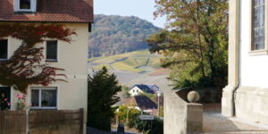 Mit dem Blick auf die Burgruine am Schlossberg starteten wir durch die heimischen herbstlich gefärbten Weinberge zu unserem Zwischenziel, dem Schwanberg. Die Traube als Symbol des „Weinparadiesweges“ führte uns bis zum Aufstieg die ersten 5 km, links immer den bunten Laubwald im Blick, rechts die Flur, später vorbei an Obstanlagen um schließlich die Weinlage „Wiesenbronner Wachhügel“ zu erreichen, dem Einstieg in die sog. „Rotweininsel“. Bedingt durch den vom Schilfsandstein geprägten Boden gedeihen hier Domina, Spätburgunder und weitere Rotweine bestens. Gleich nach dem Gedenkstein der Feldgeschworenen folgten wir einem etwas verstecktem Hinweis „Zum Schwanberg“, der uns nach knapp 2km Anstieg (ca. 180 hm) durch einen alten Hohlweg auf den ca. 480 m hohen Berg mit Schloss und Park führte.