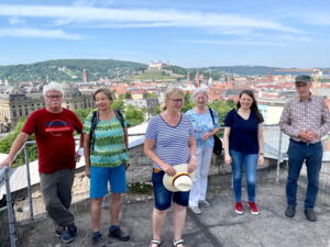 Vom Treffpunkt aus führte der Weg über den Ringpark durch die Anlage am Haugering Richtung Berliner Platz. Weiter ging es am Rennweger Ring entlang zur Johanniskirche. Der NaturFreund Eberhard Grötsch berichtete der Gruppe, dass beim Luftangriff auf die Stadt am 16. März 1945 die Johanniskirche ausbrannte und fast völlig zerstört wurde. Die Turmruine und Reste der Nordwestfassade ragten noch mehrere Jahre wie Mahnmale in den Himmel. An einen Wiederaufbau war zunächst nicht zu denken. Aktuell steht jedoch die Renovierung der damals neu erbauten Türme an. Die Gruppe hatte die einmalige Gelegenheit auf dem Turm den Ausblick über Würzburg zu genießen.