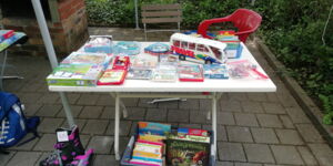 Trotz des kühlen Wetters kamen 15 eifrige Verkäufer mit ihren Spielsachen, Büchern, Rollern, usw… zum Verkaufen.