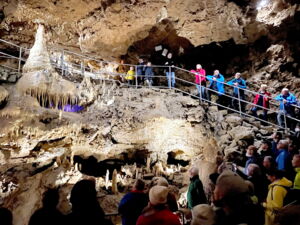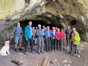 Auf dem Hinweg rief das „Walberla“, der Hausberg der Franken. Von der „Walpurgiskapelle“ nahe dem Gipfelkreuz bot sich sich ein freier Blick auf die nahen Höhen, die in den nächsten Tagen auf die Gruppe warteten. Muggendorf an der Wiesent war tags darauf Startpunkt für eine herausfordernde aber erlebnisreiche Runde. Durch die Oswaldhöhle weiter zum Quakenschloß, einem sagenumwobenen Felsengebilde, führte der Weg auf und ab wieder hoch über Treppen zum 531 m hoch gelegenen „Adlerstein“. Höhepunkt des Tages sollte jedoch das imposante Geotop die „Versturzhöhle Riesnburg“ werden. Durch sie gelangten wir über nahezu 150 Metern abwärts auf gesicherten Treppen an die Wiesent bei Doos. Die knapp 500 Höhenmeter Steigung waren genug an diesem Tag, der nach weiteren 3 km entlang der Aufseß in der „Kuchenmühle“ inmitten unberührter Natur endete.