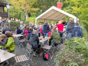 Gleichermaßen gut kam bei Jung und Alt die frisch zubereitete Kürbissuppe, mit oder ohne Würstel, an. Dazu musste unser Koch Marc 15 kg Hokaido-Kürbisse verarbeiten, und ab 16:30 Uhr hieß alles ausverkauft. Und selbst bei den hausgemachten Kuchen der Mitglieder des Vereins stand neben der Zwetschge, den Äpfeln der Kürbis auf der Rezeptur. Alles selbst zubereitet, alles aus heimischen Gärten und mit Liebe zur Natur zubereitet. Damit war es dem Verein wieder einmal bei einem seiner schon traditionellen Herbstfeste gelungen, den Besuchern aufzuzeigen, wie lecker und zugleich preiswert ein einfaches, gesundes Essen sein kann, das auch noch allen Generationen schmeckt! Diese Erkenntnis hörte Mitorganisator Sigi Hofmann in vielen Gesprächen mit Eltern heraus, die NaturFreunde sehen darin ein Lob aber auch einen Anreiz für weitere Feste / Veranstaltungen dieser Art.