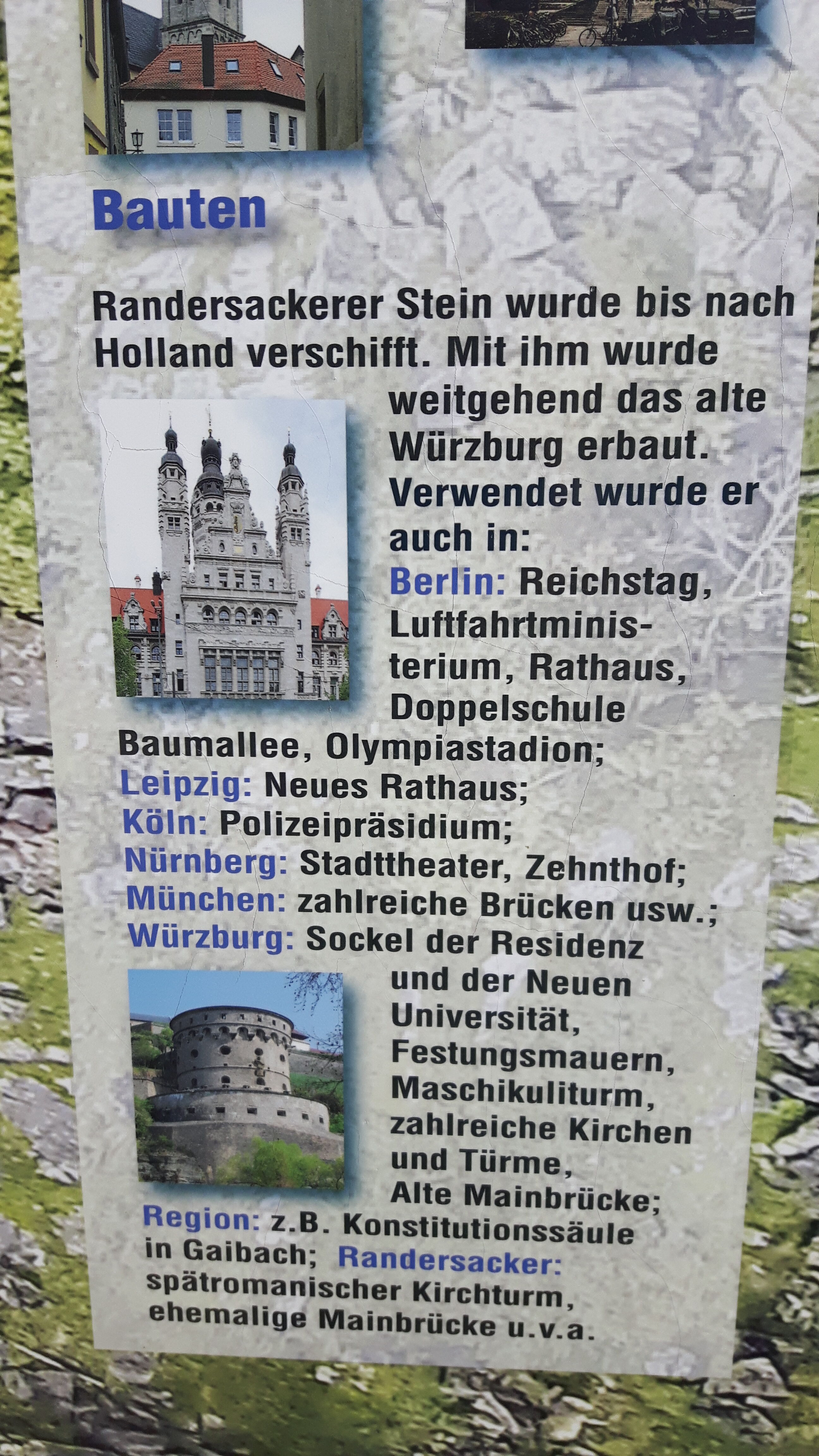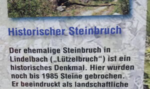 Von da aus war es nicht mehr weit, bis zum historischen Steinbruch von Lindelbach. Hier an der ehemaligen Kantine der Steinbrucharbeiter, machten wir unsere Mittagsrast und versorgten uns selbst aus unseren Rucksäcken. Das von herbstlichen Sonnenblumen umgebene Areal bot uns schattige oder sonnige Sitzplätze und lud zum Verweilen ein. Vor uns lag nun noch der Steinbruch, den wir mittels Infotafeln und auf eigene Faust, ganz individuell erkunden konnten. Dabei entdeckten wir nicht nur ein Industriedenkmal, den Derrickkran – nach einem Londoner Henker benannt - der den Arbeitern ehemals gute Dienste beim Anheben der schweren Steine bot, sondern auch die riesigen Quaderblöcke aus Muschelkalk, die in vielen historischen Gebäuden unseres Landes, wie zum Beispiel im Reichstag von Berlin verbaut wurden. Auf dem Rückweg nach Theilheim, ganz in der Nähe der Autobahn A 3, streiften wir noch die Quelle des Lützelbaches und kamen am einstigen Wirtschaftshof eines Zisterzienserklosters vorbei, das bereits im 14. Jahrhundert aufgegeben wurde und im Zuge des Autobahnbaus wieder entdeckt wurde.