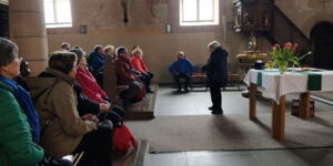 Die mehr als 1200-jährige Geschichte dieses Ortes forderte uns zu einem mehr als einstündigen Dorfrundgang mit einer betagten, aber von einer Heimatliebe geprägten Führerin heraus. „Wiesen, Wasser, Wein und Holz, das ist der Wiesenbronner Stolz“, so der Titel unserer Wanderung zeigt sich schon im Ort. Start und Ziel war der Weinfestplatz „Am Seegarten“, ein See, der bis in die 60-er Jahre noch die Ortsmitte prägte, heute aber trocken gelegt ist. Der kurze Weg zur Kirche inmitten der ehemaligen Kirchenburg lohnte sich. Bei Gefahr zogen sich die Menschen in die Gaden zurück, welche den ganzen Kirchberg z.T. zwei Stockwerke tief unterkellern. Kirche, Schulhaus, Gaden, die alte Schmiede, alle alten Gebäude bestehen aus Schilfsandstein, gebrochen aus den Steinbrüchen im nahen Wald. Das evangelische Gotteshaus erhielt seine heutige Form um das Jahr 1620, die freigelegten Fresken weisen uns aber auf die frühere Entstehungsgeschichte hin. Am Schloßgraben vorbei erreichten wir die Synagoge und einige ehemalige Häuser, heute ganz toll restauriert, welche Zeugnis abgeben für das lange friedliche, gemeinsame Leben von jüdischen und deutschen Menschen; die Kinder gingen alle in ein Schulhaus, nur der jüdische Religionsunterricht fand in einem kleinen Haus statt. Ende unserer Führung war das alte Rathaus mit seinem sehenswerten Glockenspiel, das stündlich den Winzer und seinen Kontrahenten, den Häcker, „schlagen“lässt.