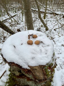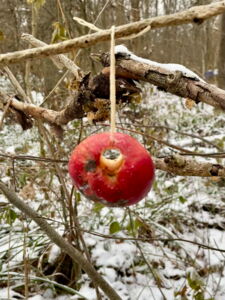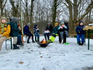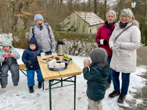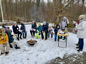 15 Kinder waren am 4. Adventssonntag der Einladung von Organisatorin Natalie Durhack gefolgt und mit ihren Eltern gekommen, um an der traditionellen Waldweihnacht teilzunehmen. Schnell waren die mitgebrachten Äpfel, Karotten Meisenknödel und Nüsse vorbereitet, um sie anschließend beim Spaziergang durch den verschneiten Wald den Tieren „mundgerecht“ servieren zu können. Die Kälte von minus 10 Grad machte allen klar, dass wir den Tieren in dieser Zeit helfen müssen. Auf dem Rückweg freuten sich alle schon auf die Wärme, ausgestrahlt von der Feuerschale. Der Kinderpunsch und das Weihnachtsgebäck schmeckte allen, während Elisabeth ein paar lustige Weihnachtsgeschichten vorlas. Doch nach rund 1,5 Stunden drängte es alle in die warme Stube, dort wartete schon Iris, um mit den Kleinen weihnachtlichen Schmuck für den Christbaum zu basteln.