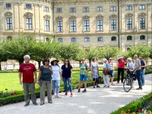 Vom Treffpunkt aus führte der Weg über den Ringpark durch die Anlage am Haugering Richtung Berliner Platz. Weiter ging es am Rennweger Ring entlang zur Johanniskirche. Der NaturFreund Eberhard Grötsch berichtete der Gruppe, dass beim Luftangriff auf die Stadt am 16. März 1945 die Johanniskirche ausbrannte und fast völlig zerstört wurde. Die Turmruine und Reste der Nordwestfassade ragten noch mehrere Jahre wie Mahnmale in den Himmel. An einen Wiederaufbau war zunächst nicht zu denken. Aktuell steht jedoch die Renovierung der damals neu erbauten Türme an. Die Gruppe hatte die einmalige Gelegenheit auf dem Turm den Ausblick über Würzburg zu genießen.